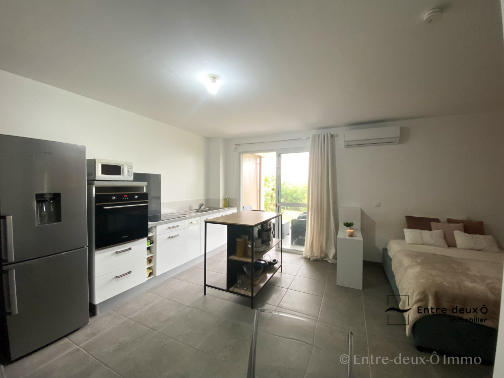 Appartement comprenant une entrée menant à un espace de vie avec une cuisine ouverte équipée, qui s'ouvre sur une terrasse.
