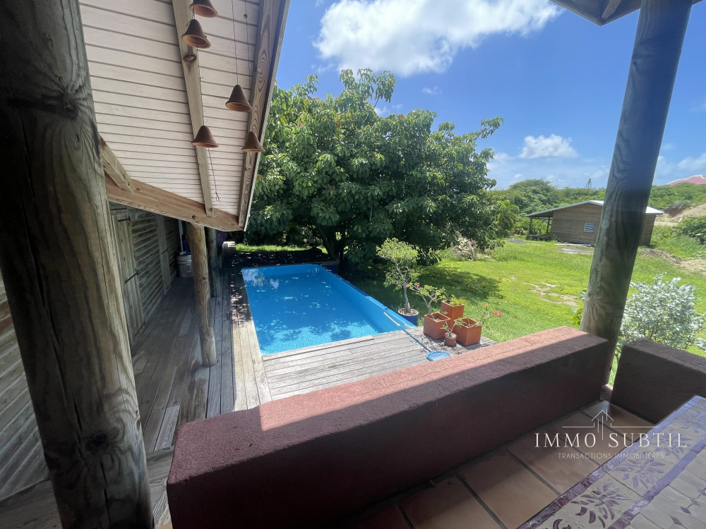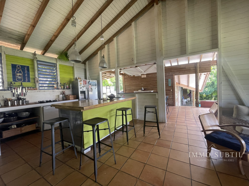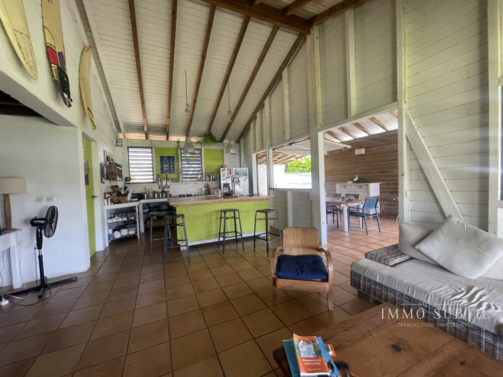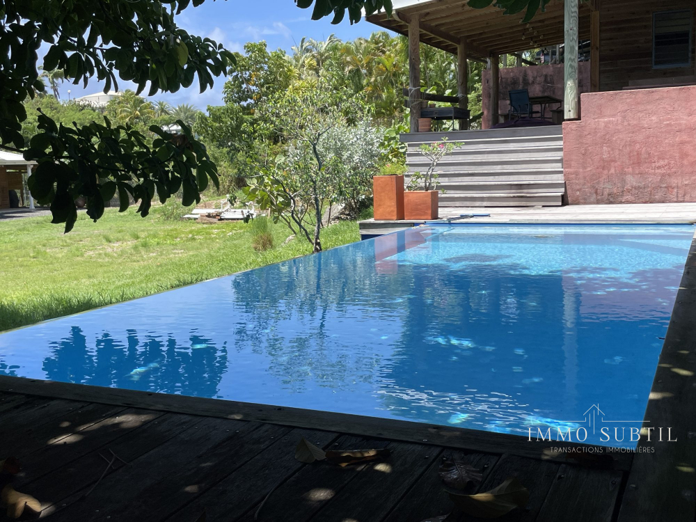 Le côté jour, qui offre un séjour et une cuisine ouverte prolongée par une grande terrasse qui surplombe la piscine.