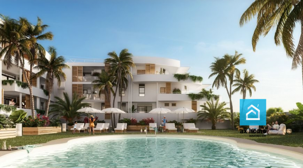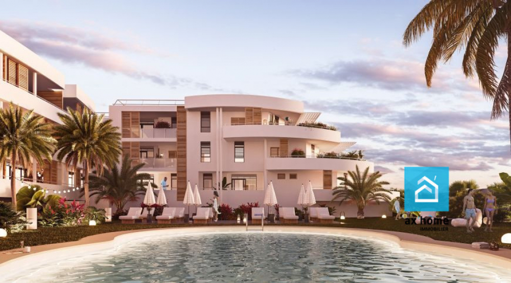 À vendre à Sainte-Anne (97180) : appartement neuf de 66 m² au premier étage. Il comporte une pièce à vivre, deux chambres, une salle d'eau et des toilettes. En annexe, il y a une piscine, un balcon (10 m²) et une place de parking.