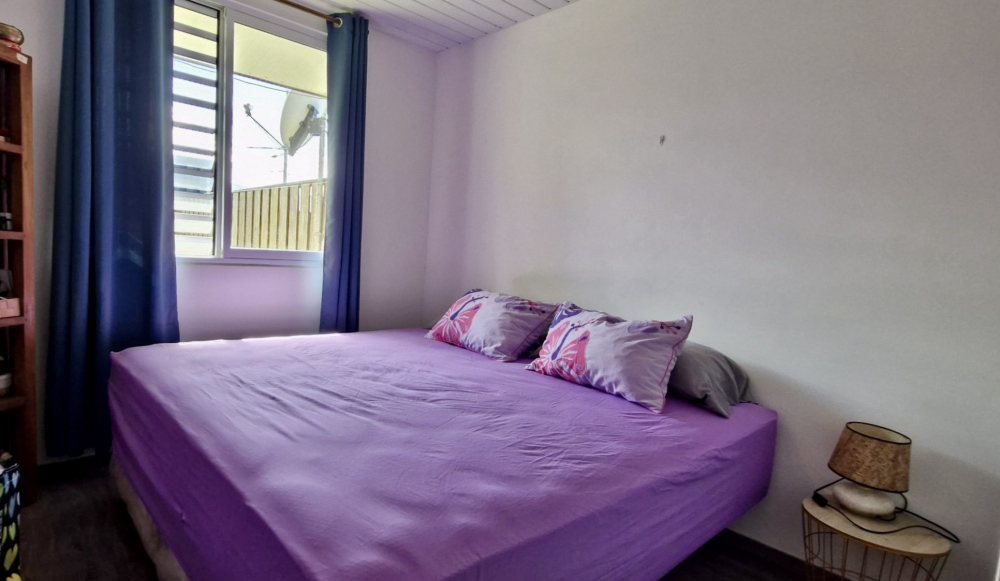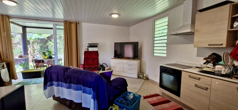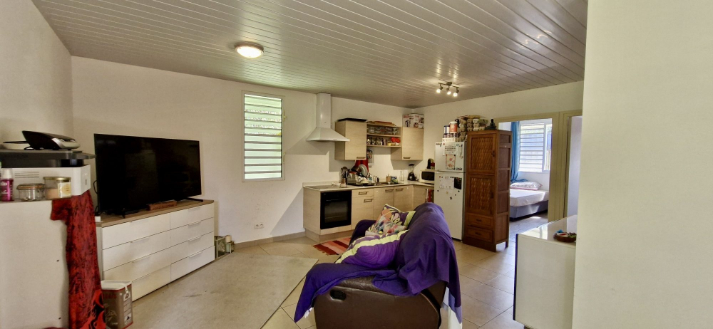 Elle est composée d'un salon, d'une cuisine aménagée et équipée, de deux chambres avec rangements, d'une salle d'eau et d'un garage.
