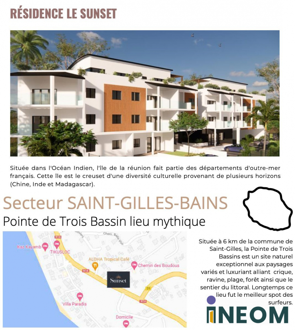 Sur la commune de Trois Bassins, vue mer, copropriété privée et sécurisée de 19 logements et 2 commerces sur 3 niveaux.