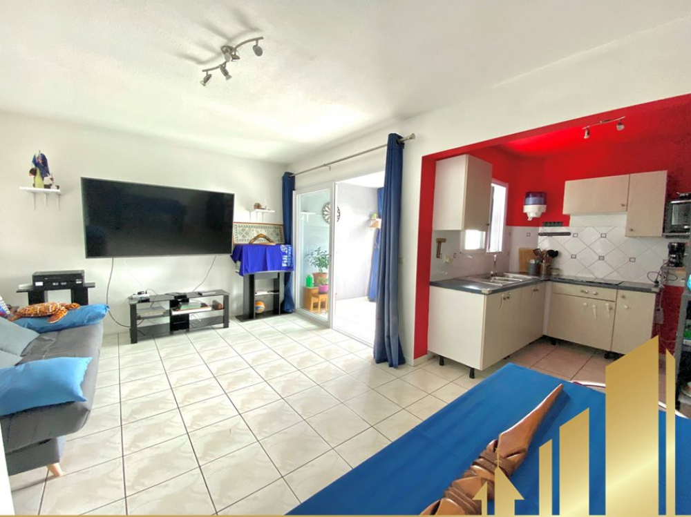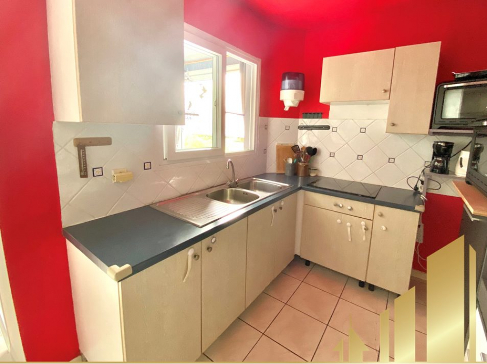 Cuisine ouverte sur séjour, un séjour-salon, une chambre climatisée avec placard, une salle d'eau avec wc et une buanderie
