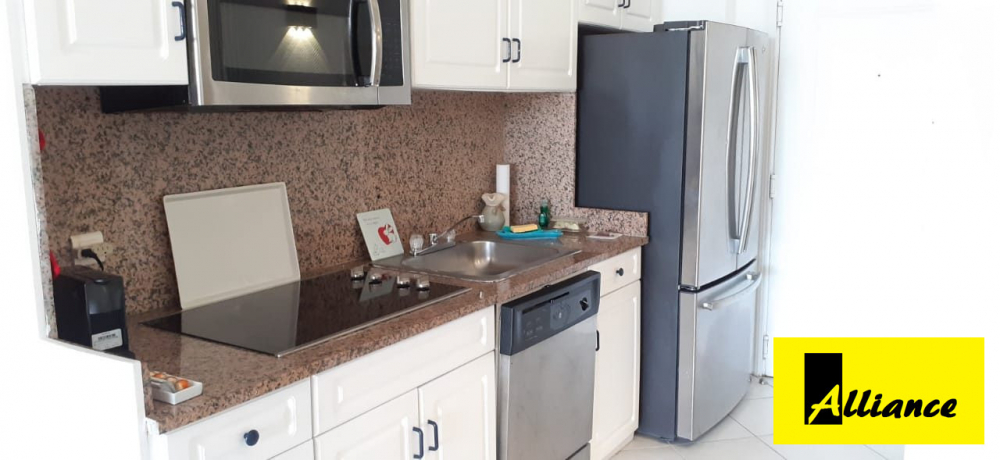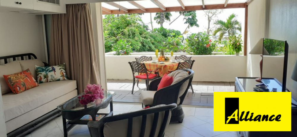 en partie hollandaise dans le quartier de Cupecoy, un grand studio meublé avec terrasse et belle vue mer. Résidence entretenue, gardiennage assuré 24H/24, service hôtelier,