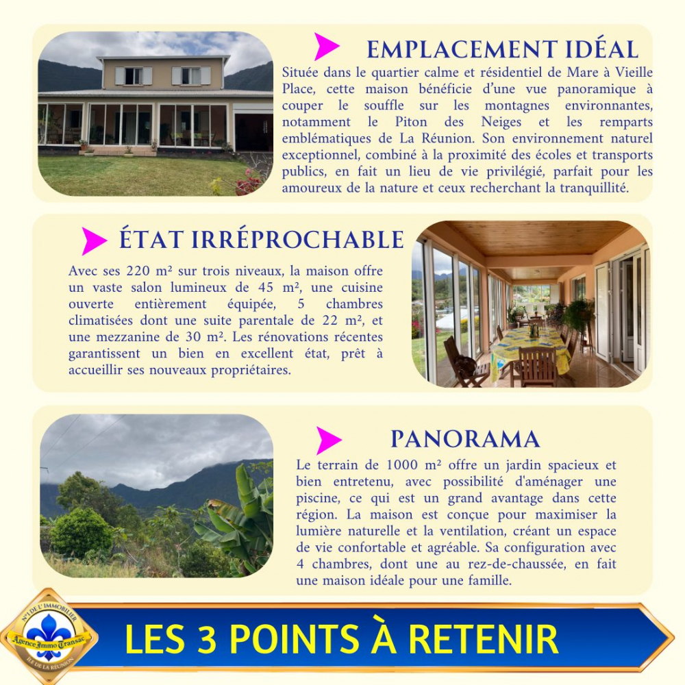 C'est ce que l'Agence IMMO TRANSAC REUNION a le plaisir de vous faire découvrir : une maison exceptionnelle à SALAZIE, combinant localisation en pleine nature, surface généreuse, et prestations offrant confort et vue exceptionnelle.