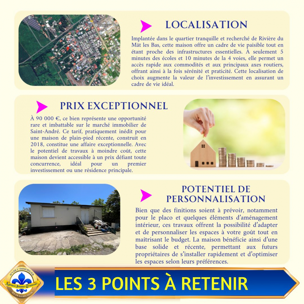 Imaginez-vous habiter dans une MAISON nichée dans le quartier paisible de Rivière du Mât les Bas, offrant un cadre de vie calme et une proximité avec les commodités essentielles de Saint-André.