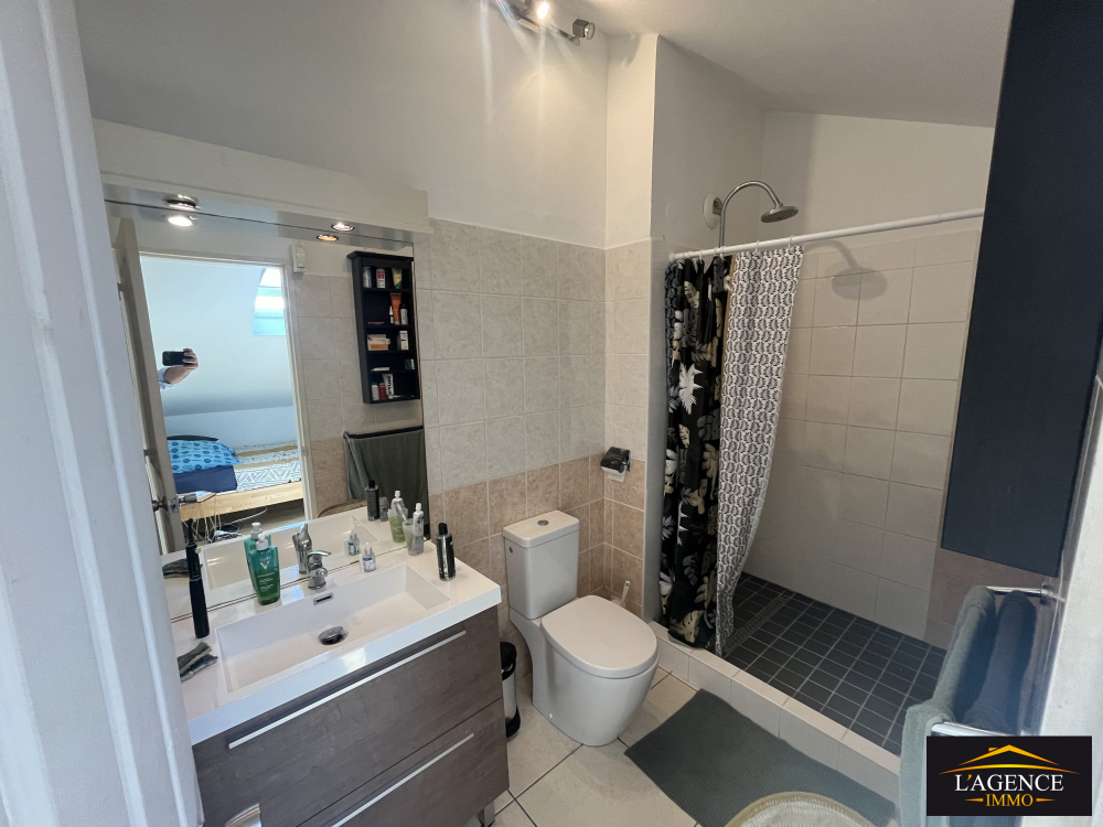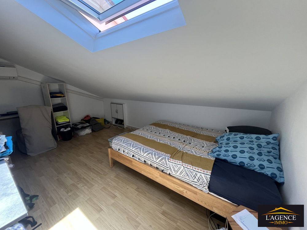 À l'étage, deux petites chambres mansardées, dont l'une avec une salle d'eau et WC, idéale pour un adolescent. Garage pour deux voitures avec point d'eau.