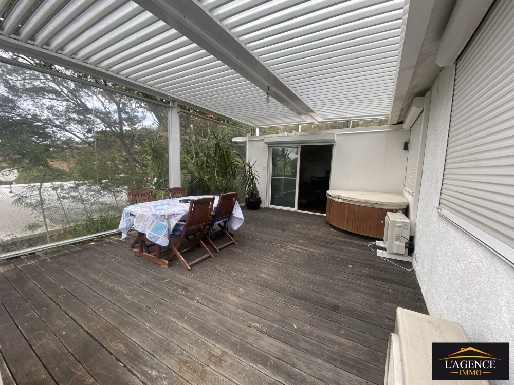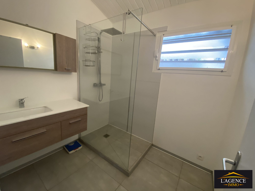 À louer : charmante villa de type F4 de 120 m², disposant d'un garage de 30 m², accessible par un portail électrique. Elle comprend une entrée donnant sur un séjour climatisé avec une cuisine moderne aménagée et entièrement équipée, agréée d'un îlot central. Une buanderie avec accès direct au garage, un dégagement, une salle d'eau, des toilettes séparées, deux chambres climatisées, ainsi qu'une suite parentale climatisée avec dressing, salle d'eau et toilettes privatives.