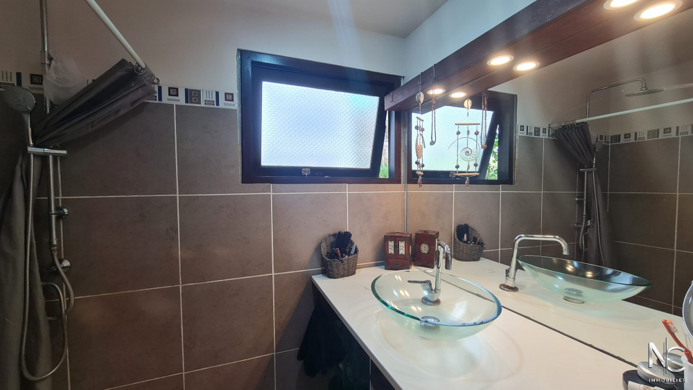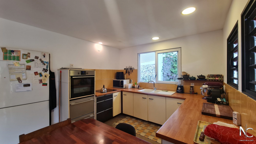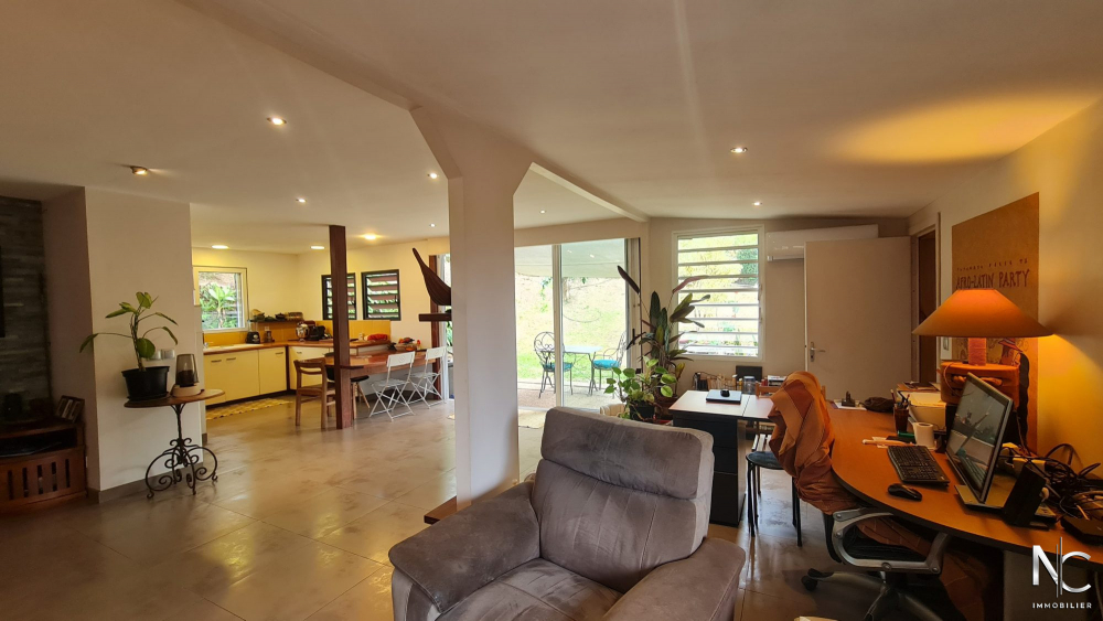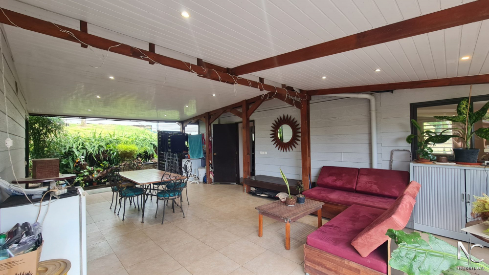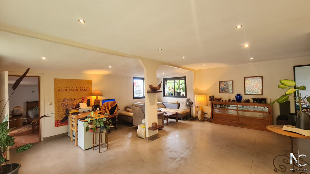 La villa F2, de construction traditionnelle, offre un séjour avec une cuisine équipée, une chambre climatisée, un dressing et salle d'eau avec wc. Elle bénéficie d'une grande terrasse couverte sans aucun vis-à-vis et d'un grand atelier.