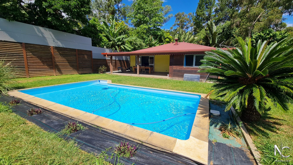 Belle terrasse couverte donnant sur piscine au sel. Belle vue dégagée.