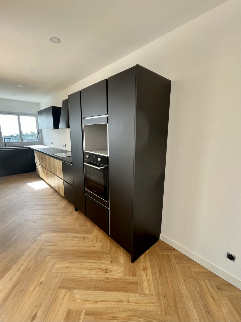 L'appartement propose des équipements et du mobilier de qualité : parquet chevron, cuisine moderne avec de nombreux rangements, miroirs LED...