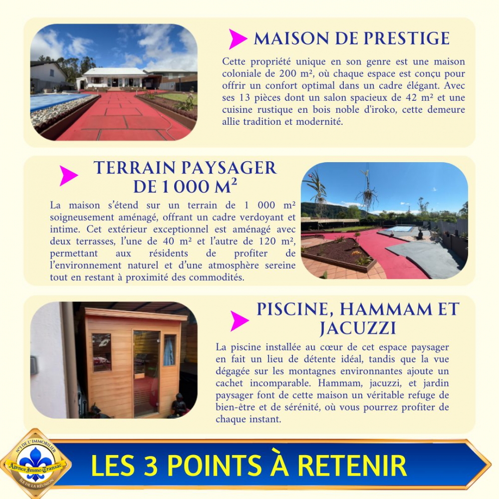 MAISON COLONIALE D'EXCEPTION : D'une superficie de 200 m², cette maison de type F13 allie charmante architecture coloniale et modernité, avec un agencement idéal pour accueillir toute la famille.