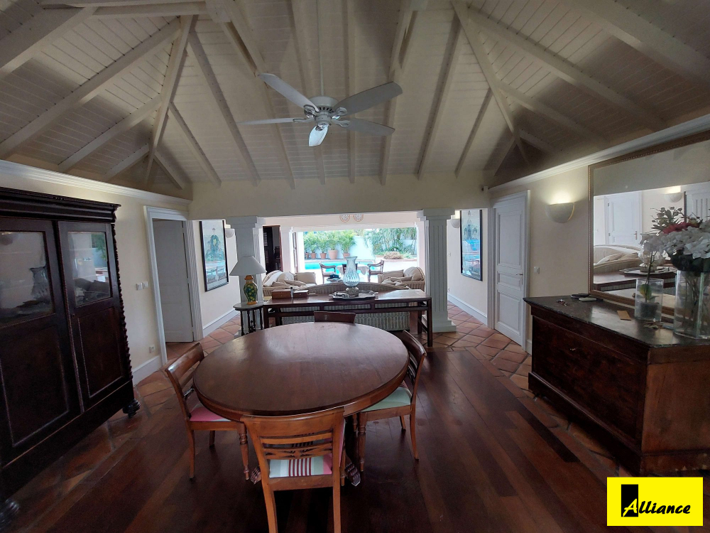 Sur la Baie Nettlé, villa de plain-pied de 5 pièces d'une superficie de 150m2 environ comprenant un grand salon / salle à manger, une cuisine américaine, 4 chambres, 3 sanitaires décorée dans un style créole avec parquet en bois rouge, jalousie aux portes et toit cathédrale. Ce bien a beaucoup de cachet!