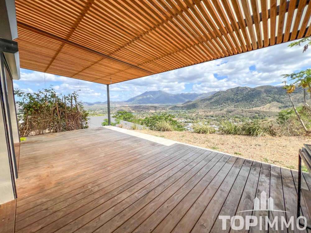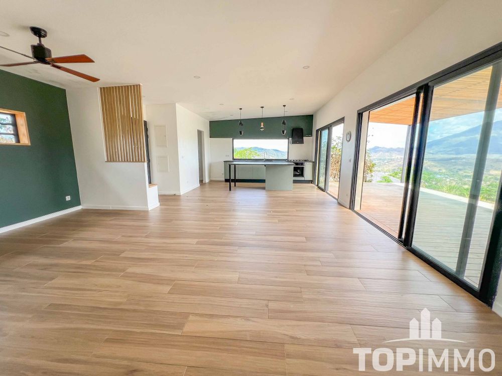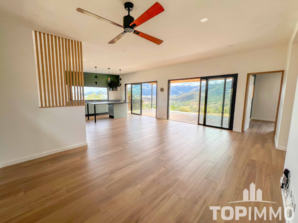 Le séjour lumineux s'ouvre sur une spacieuse terrasse couverte de 28 m², offrant une vue panoramique sur les montagnes, sans aucun vis-à-vis. La cuisine aménagée et équipée comprend un four intégré, une hotte, un évier et un îlot central avec de nombreux rangements et plusieurs prises électriques. Une buanderie/garde-manger, attenante à la cuisine, facilite l'organisation du quotidien. Une grande fenêtre fixe permet en outre de profiter d'une vue imprenable sur la baie et les montagnes depuis la cuisine.