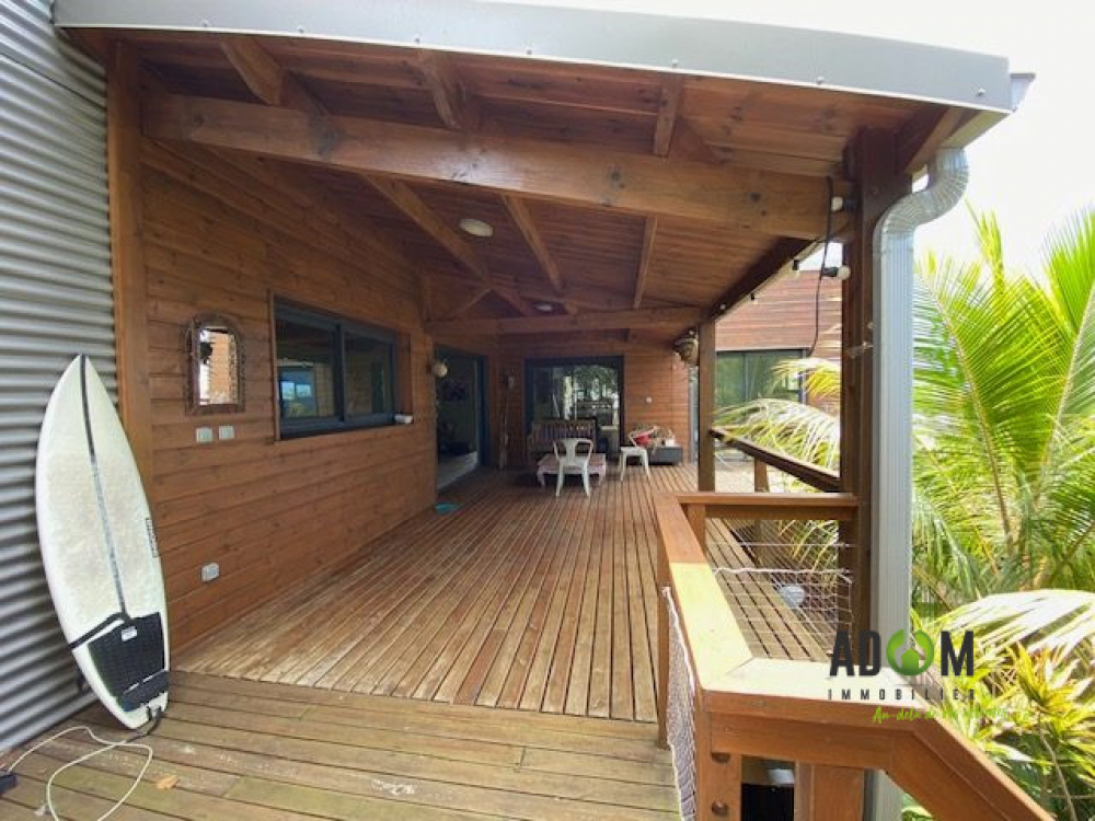 De construction bois, la villa a été édifiée avec une belle hauteur sous plafond et propose plusieurs terrasses couvertes dont une offrant une vue sur l'océan