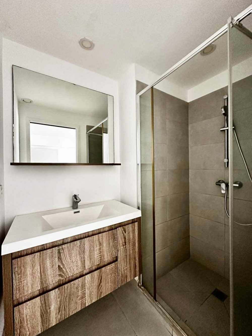 La chambre climatisée de 11,74 m² est équipée de volets roulants, d'un balcon privatif et d'un dressing. La salle d'eau de 2,06 m² avec meuble vasque moderne et les WC séparés assurent confort et praticité. Un cellier de 3,53 m² complète l'espace nuit pour vos besoins de rangement.