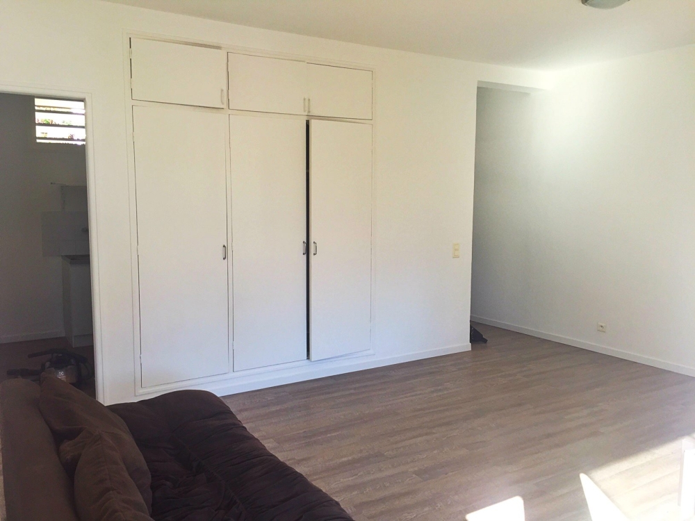 La pièce principale de 25 m², climatisée et équipée de rangements, bénéficie d'une grande baie vitrée qui apporte une belle luminosité naturelle. La cuisine attenante de 3 m² est fonctionnelle et permet de cuisiner confortablement au quotidien.