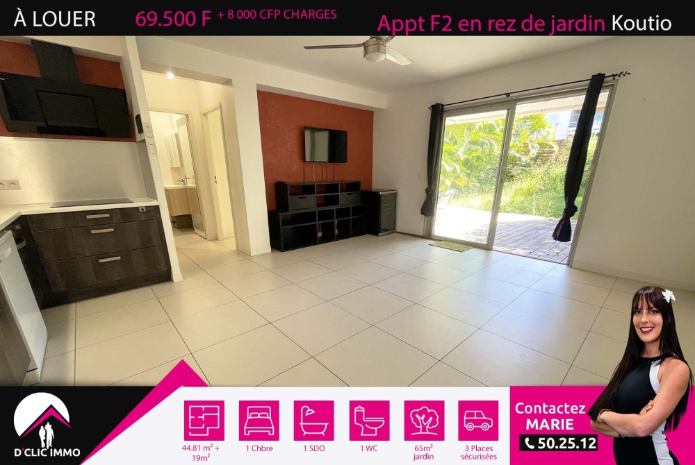 Situé en impasse dans un quartier calme de Koutio DUMBEA, à deux pas des des commerces et de toutes commodités, l'agence D'CLIC IMMO vous propose en exclusivité un spacieux appartement de type F2 en rez de jardin aux prestations modernes, très calme et sans vis à vis de 44.81m² habitable + 19m² de terrasse + 65m² de jardin + 3 places de parking privatives et sécurisées, dans la résidence sécurisée « LE BARY 2 », datant de 2018, très bien entretenue.