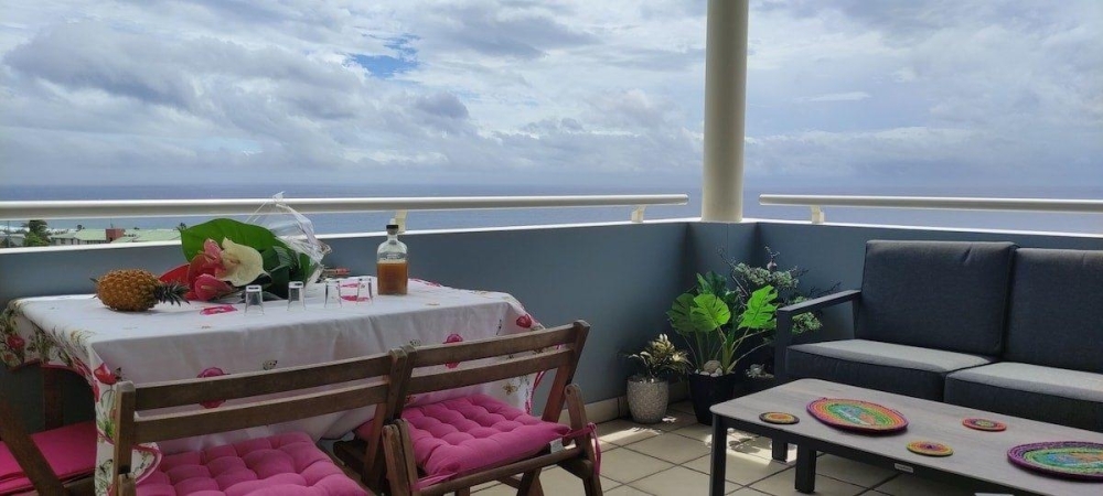 Sur la terrasse avec un salon de jardin et table à manger, des fauteuils, belle vue océan, superficie 14 m2