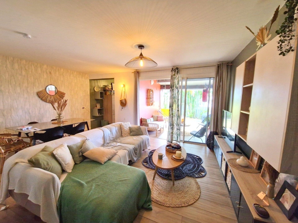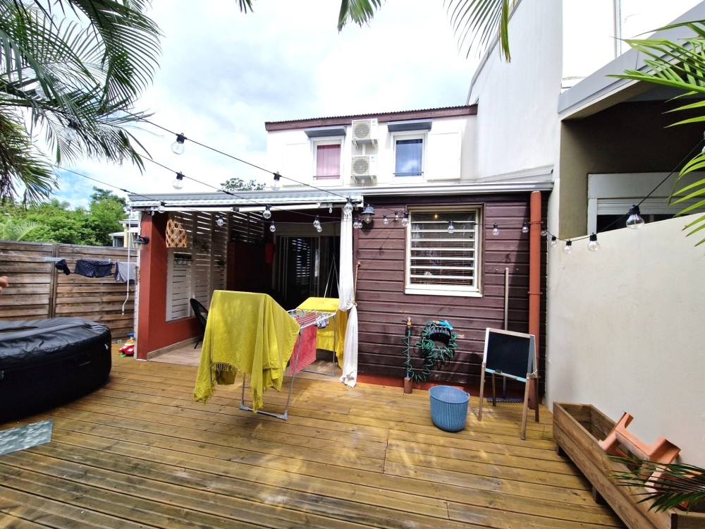 Disponbile le 1/10/2025 - Résidence LE JARDIN DE L'EPERON, 80 route de l'Eperon - Belle villa de type F5 jumelée (non meublée) sur 2 niveaux, d'une surface habitable de 100 m² + varangue de 12 m² prolongée d'une large terrasse (deck) de 30 m2 environ avec limite de propriété bien arborée par des multipliants, avec jardinet et porche à l'arrière ; offrant :