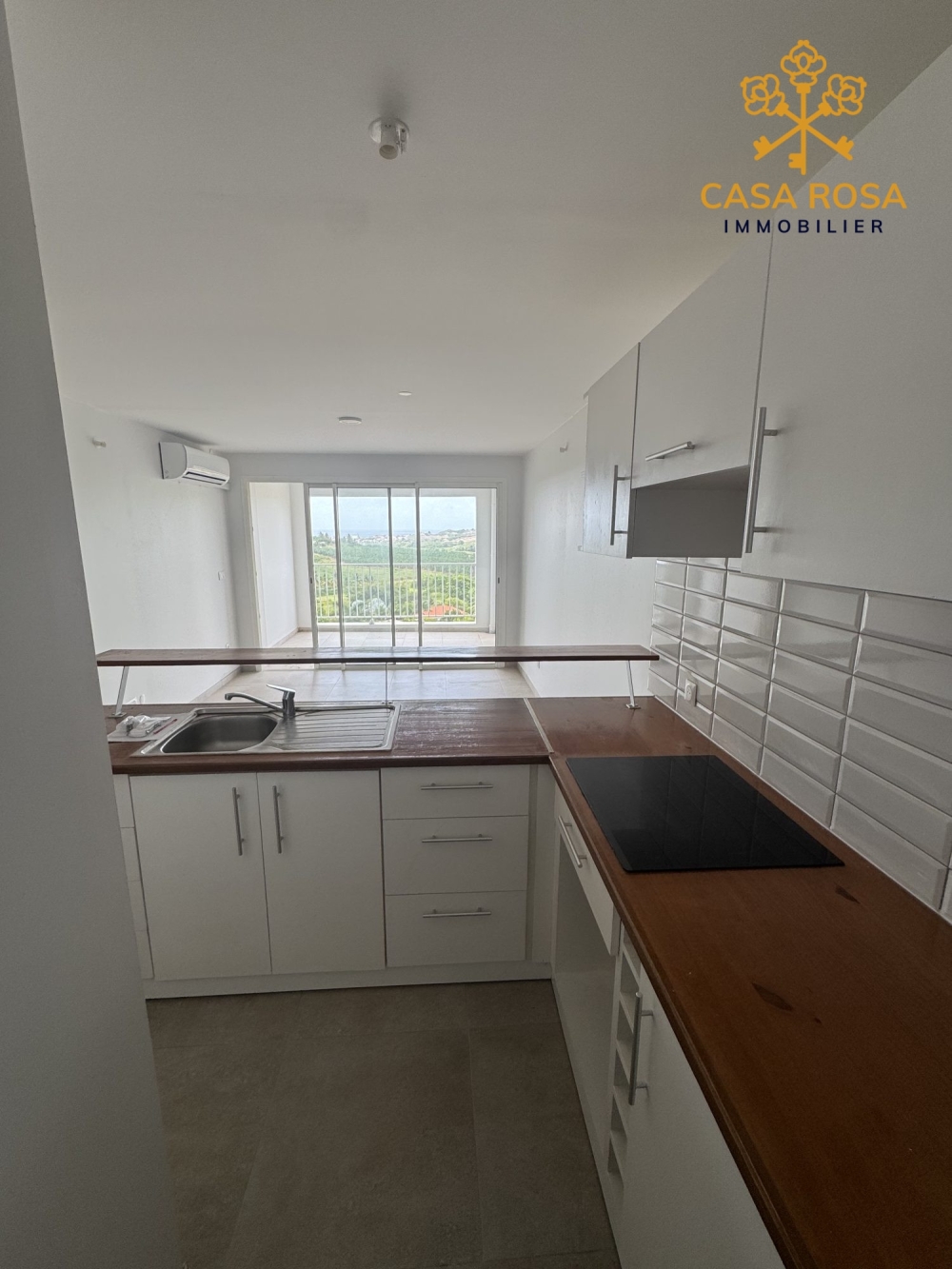 Un séjour climatisé avec cuisine ouverte, aménagée avec meubles hauts et bas, et semi-équipée (plaque de cuisson),