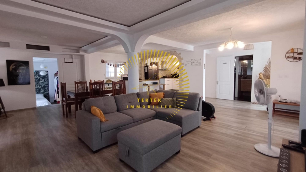 Au rez-de-chaussée, le logement principal vous séduira par ses volumes généreux. La pièces de vie offre une superficie de 51 m² ouvrant sur une cuisine de 12 m². Il y a 3 chambres dont une de 9,60 m², une de 10 m² et une de 14 m² avec terrasse privative. La salle d'eau offre une superficie de 6,58 m².