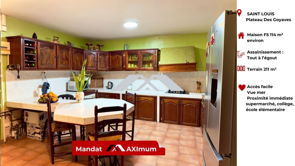 MAXImmo vous propose cette maison d'environ 114 m² habitables, édifiée sur une parcelle de 211 m². Elle est située à moins de 10 minutes du centre-ville de Saint-Louis, dans le quartier bien desservi de Plateau des Goyaves.