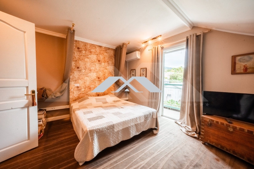 Une belle maison sur deux niveaux comprenant au rez-de-chaussée, un bar spacieux avec cave et buanderie, deux bureaux lumineux, une salle de bain rénovée, un wc indépendant, un séjour avec cheminée et une cuisine. À l'étage, 5 chambres dont une suite avec sa propre salle de bain, 2 buanderies et un balcon agréable offrant une vue mer.