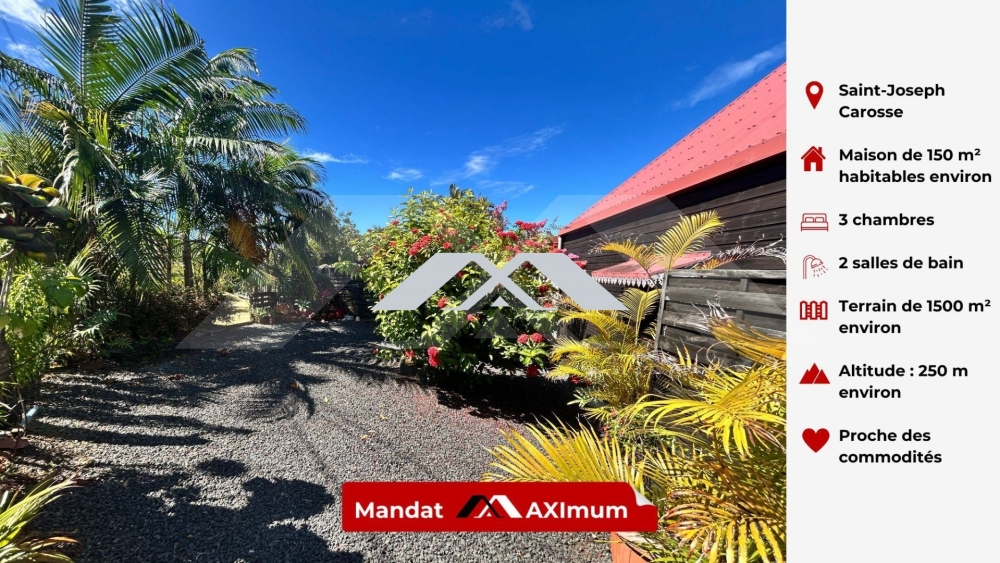 Le tout implanté sur une parcelle d'environ 1584 m² entièrement clôturée, arborée et a environ 250 m d'altitude sur le secteur de Carosse à Saint-Joseph. A visiter sans tarder.