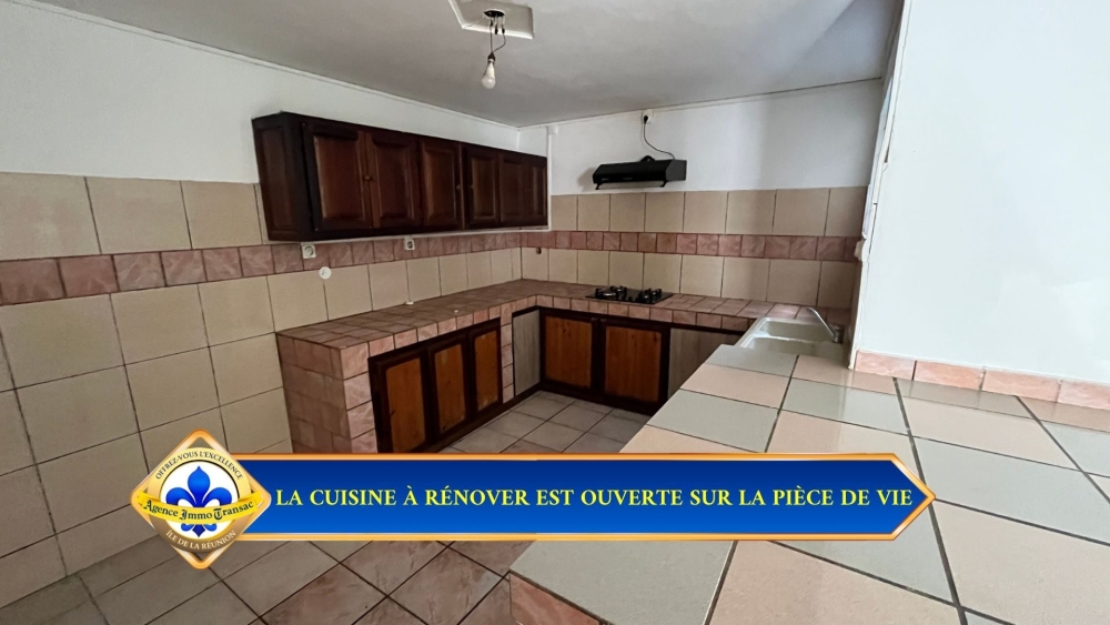 La cuisine à rénover s'ouvre sur la pièce de vie, facile à personnaliser et à adapter à vos envies.