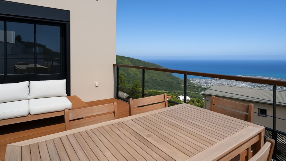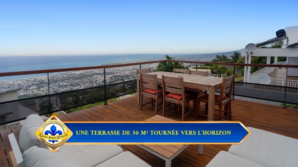 TERRASSE PANORAMIQUE DE 50 M² : Véritable belvédère sur l'océan Indien, cette terrasse en bois avec garde-corps verre offre un espace repas face au panorama. Le panorama à 180° embrasse l'océan et les reliefs montagneux.