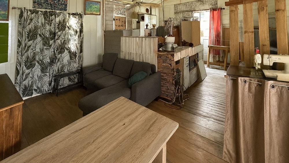 CUISINE OUVERTE À RÉORGANISER : Actuellement intégrée au séjour, elle attend une nouvelle organisation pour gagner en confort et fonctionnalité.