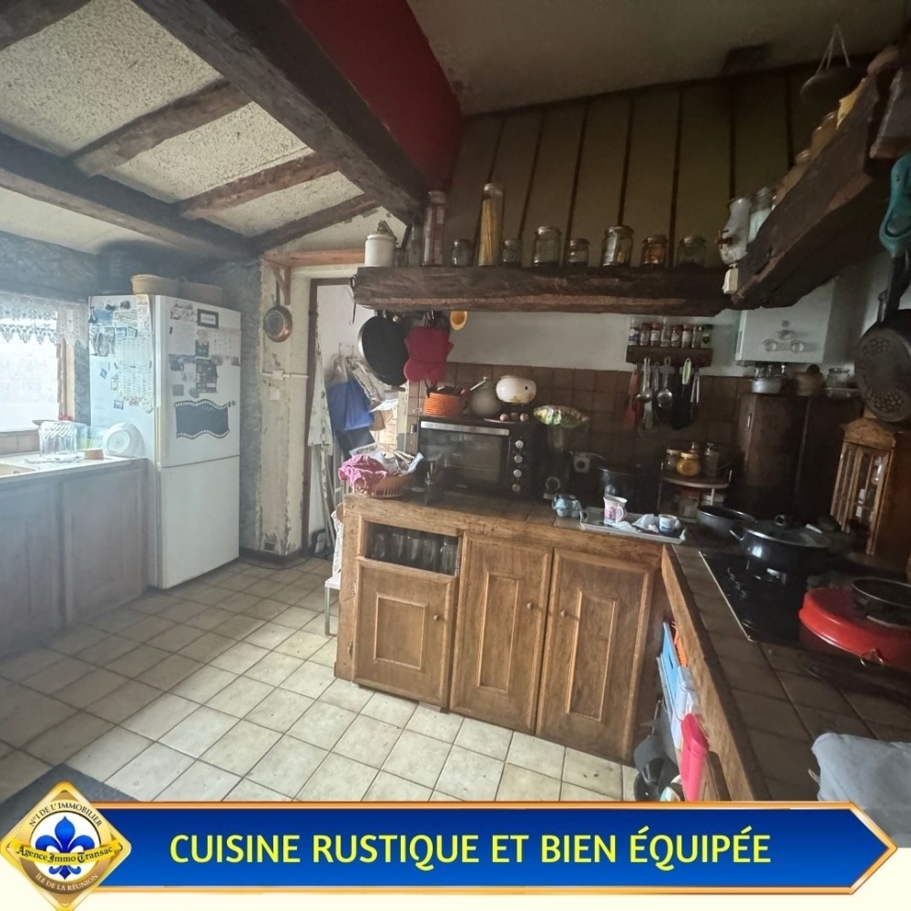 CUISINE RUSTIQUE ET BIEN ÉQUIPÉE : La cuisine est dotée de meubles en bois massif et d'un double évier sous une large fenêtre. Avec ses étagères pratiques et sa hotte en bois, elle allie fonctionnalité et authenticité.