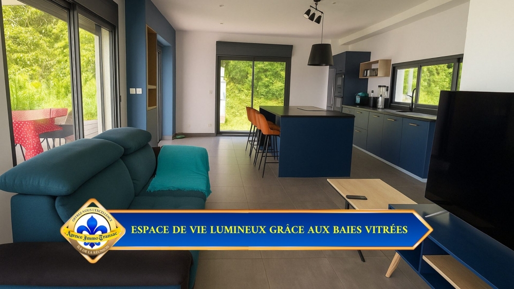 UN SÉJOUR LUMINEUX ET CONVIVIAL : Le séjour baigne dans la lumière naturelle, ouvert sur la terrasse pour des moments de partage en toute fluidité.