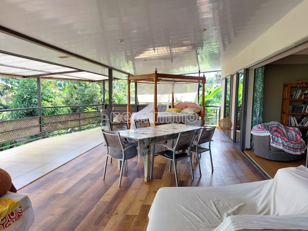 Dans un cadre verdoyant, joli terrain agréablement arboré d'arbres fruitiers, vous disposerez d'un garage couvert 2 véhicules avec son atelier, 1 Fare Pote, 1 salle de sport, 1 Four Tahitien.
