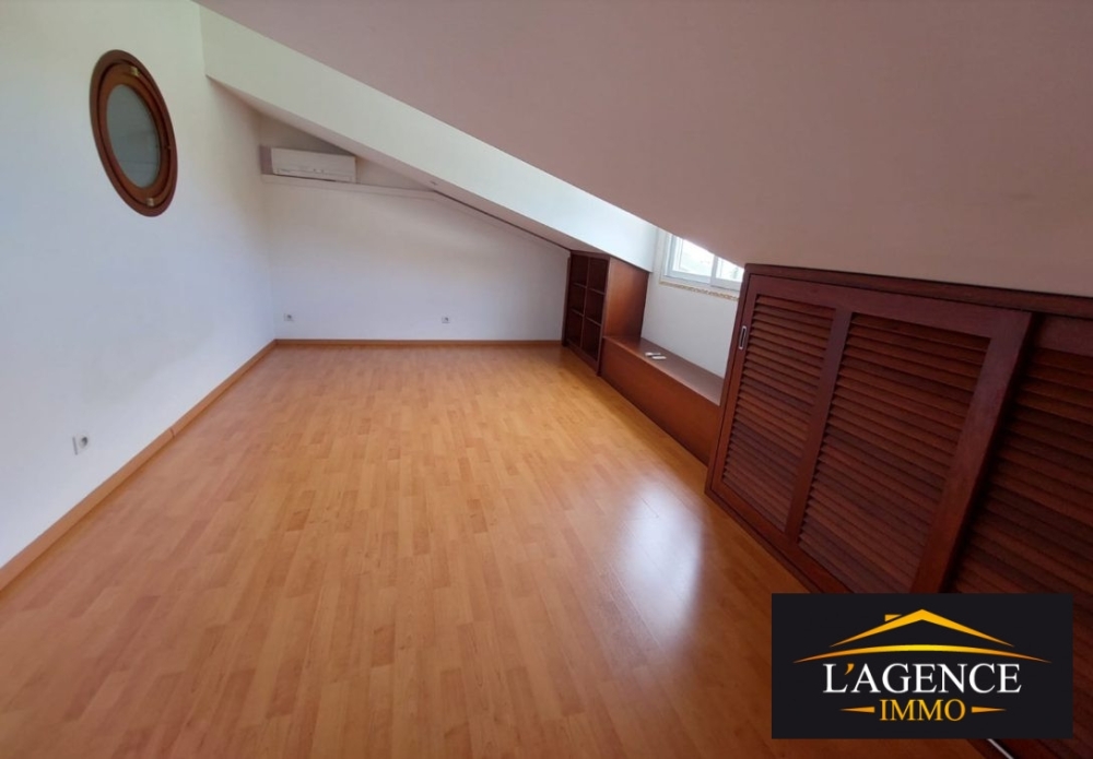 A l'étage, une chambre climatisée avec placards, une pièce attenante pouvant faire office de bureau ou de chambre pour enfant, une salle de bain et un WC indépendant.