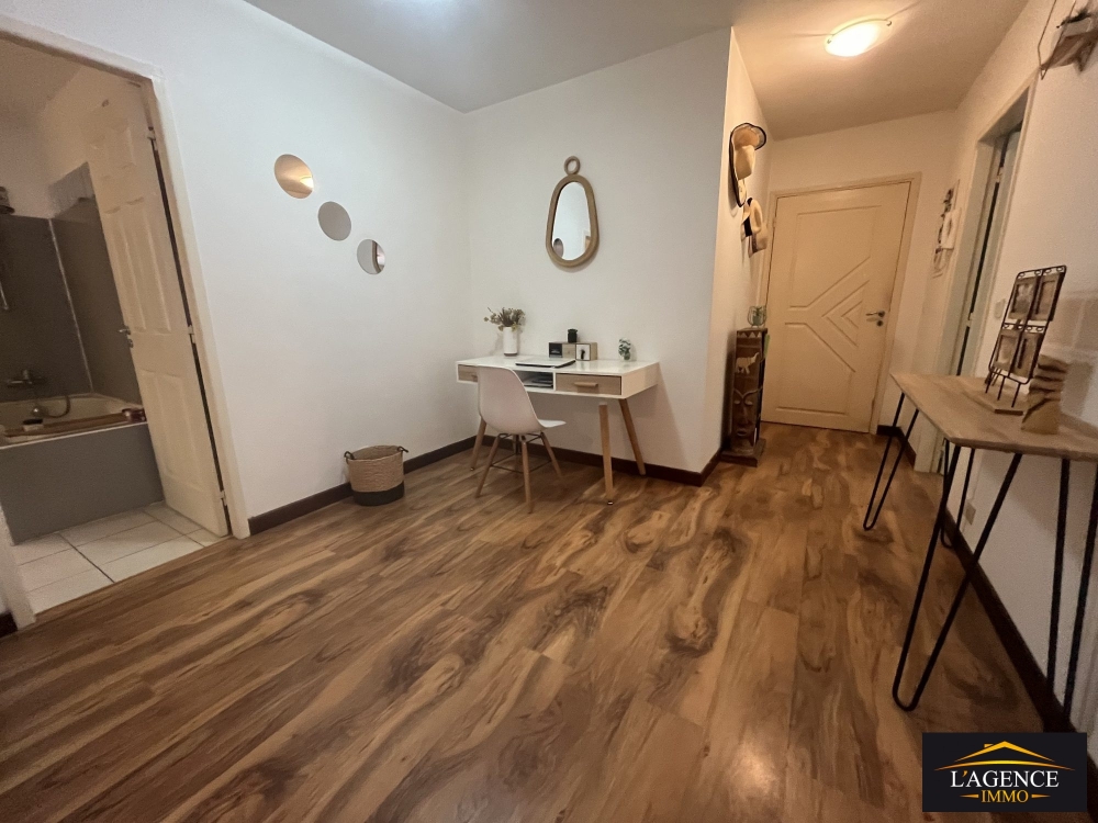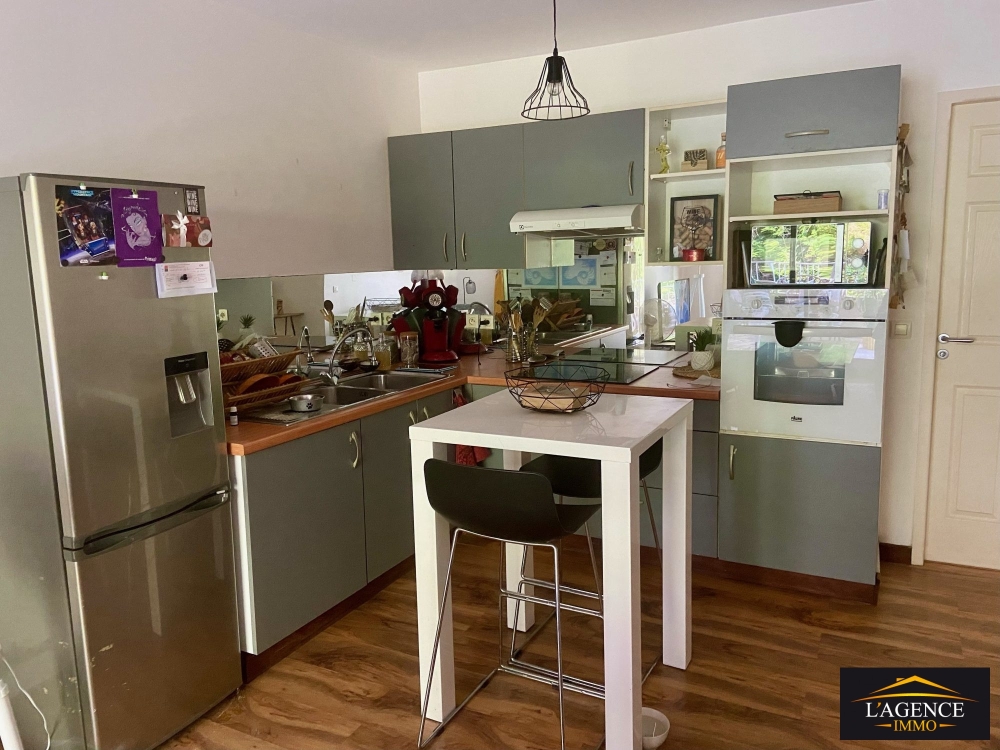 ce spacieux F2 de 49 m² comprend une entrée, un séjour avec cuisine équipée, une grande chambre avec placards, une salle de bains avec baignoire, un WC séparé, une buanderie ainsi qu'un espace pouvant servir de bureau. Une terrasse couverte de 18 m² offre une vue agréable dans un cadre végétal.