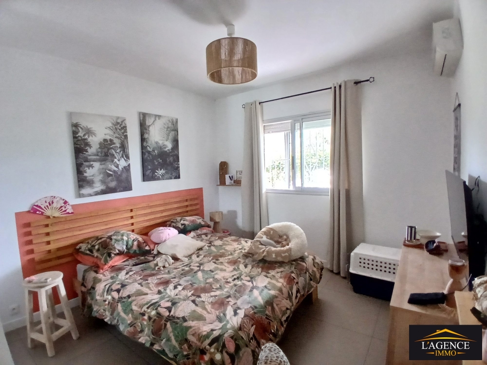 Villa F4 d'une superficie d'environ 90m² composée d'une cuisine équipée et aménagée, d'une buanderie, d'un séjour, d'un WC indépendant, d'une salle d'eau avec WC, de trois chambres climatisées avec placards, d'une grande terrasse couverte donnant sur le jardin.
