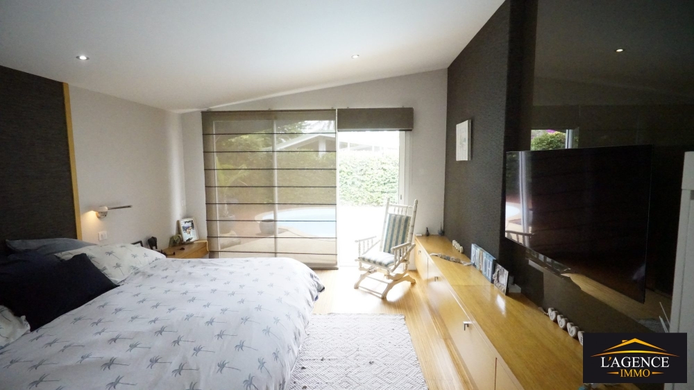 Elle se compose d'un séjour lumineux, d'une cuisine américaine moderne et équipée, d'une salle de billard, d'un espace nuit avec trois chambres climatisées équipées de placards, ainsi qu'une suite parentale avec dressing et salle de bains (baignoire + douche). Vous trouverez également une salle d'eau avec buanderie. Côté extérieur, vous profiterez d'une agréable terrasse couverte de 35 m², d'une piscine, d'un abri de jardin, d'un cellier et d'un environnement calme et sécurisé. combien il y a t il de pièce d eau et de wc dans cette annonce La villa est équipée de volets roulants électriques.