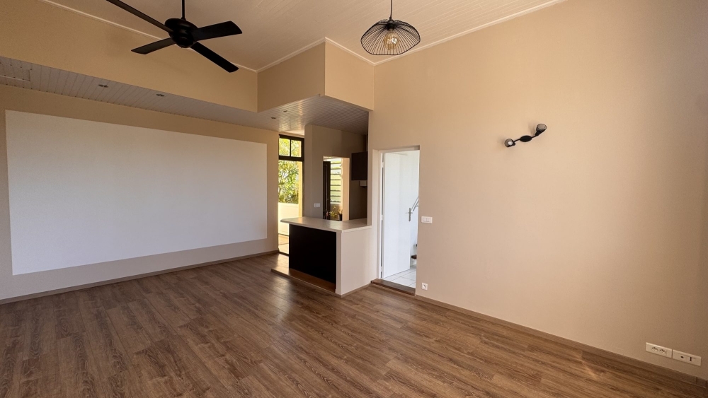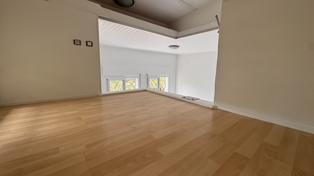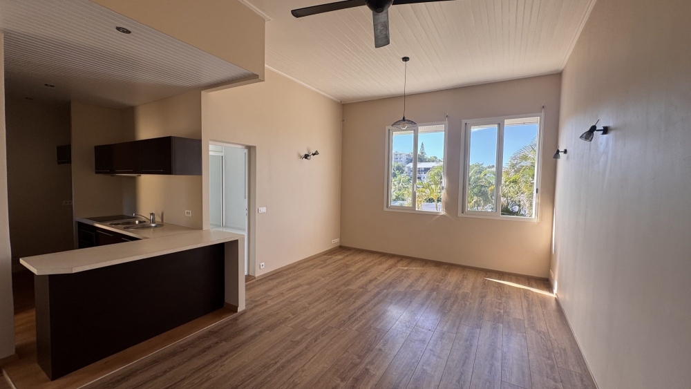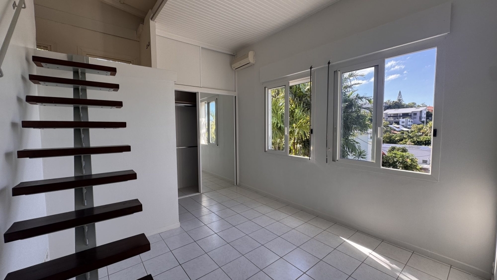 Appartement au 1er et dernier étage, avec accès indépendant de plain pied, comprenant : cuisine américaine , équipée et aménagée ouverte sur séjour avec grande hauteur sous plafond, chambre climatisée avec placards, mezzanine et salle d'eau,