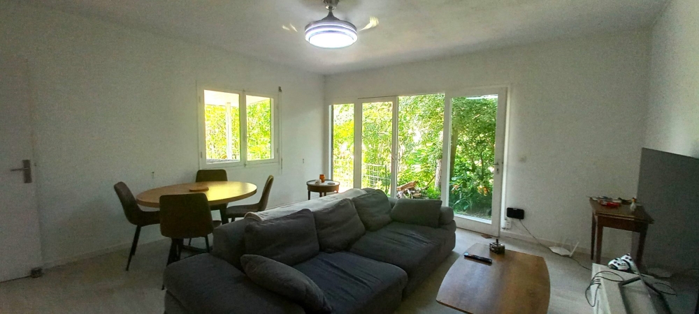 Dans un écrin de verdure, au calme, sur 9 ares de terrain , Bas de villa comprenant : cuisine équipée et aménagée ouverte sur séjour, 2 grandes chambres avec placards et dressing, salle d'eau. Terrasse couverte. Piscinable