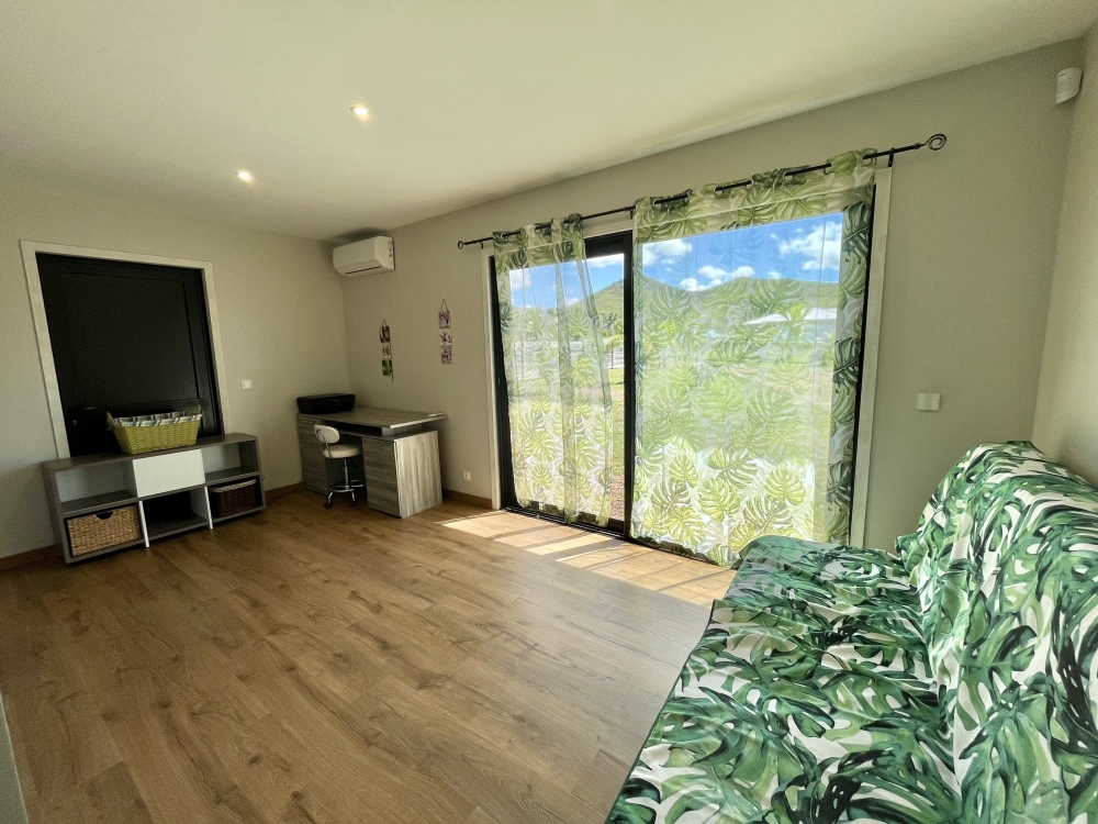 La villa comprend : une grande pièce de vie, avec cuisine américaine toute équipée, quatre chambres climatisées et sécurisées avec volets roulants, dont une aile parentale avec chambre vue sur le jardin, salle d'eau, WC indépendant, et dressing.