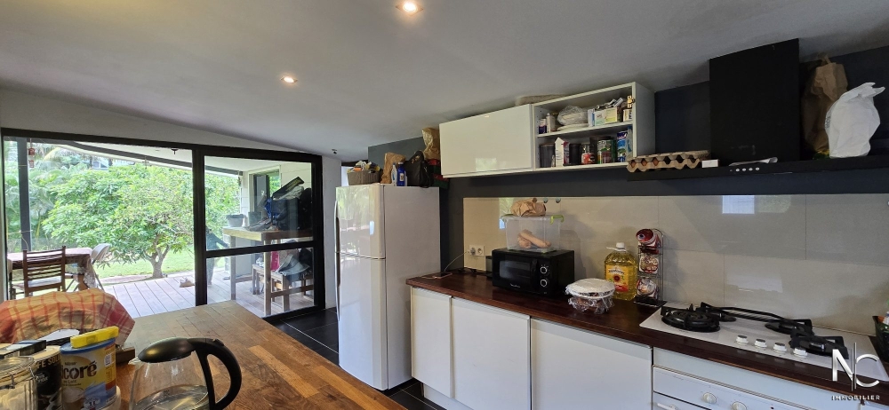 La maison se compose de trois pièces harmonieusement agencées, incluant le séjour, la cuisine équipée avec un ilot central, deux chambres et une salle d'eau avec wc.
