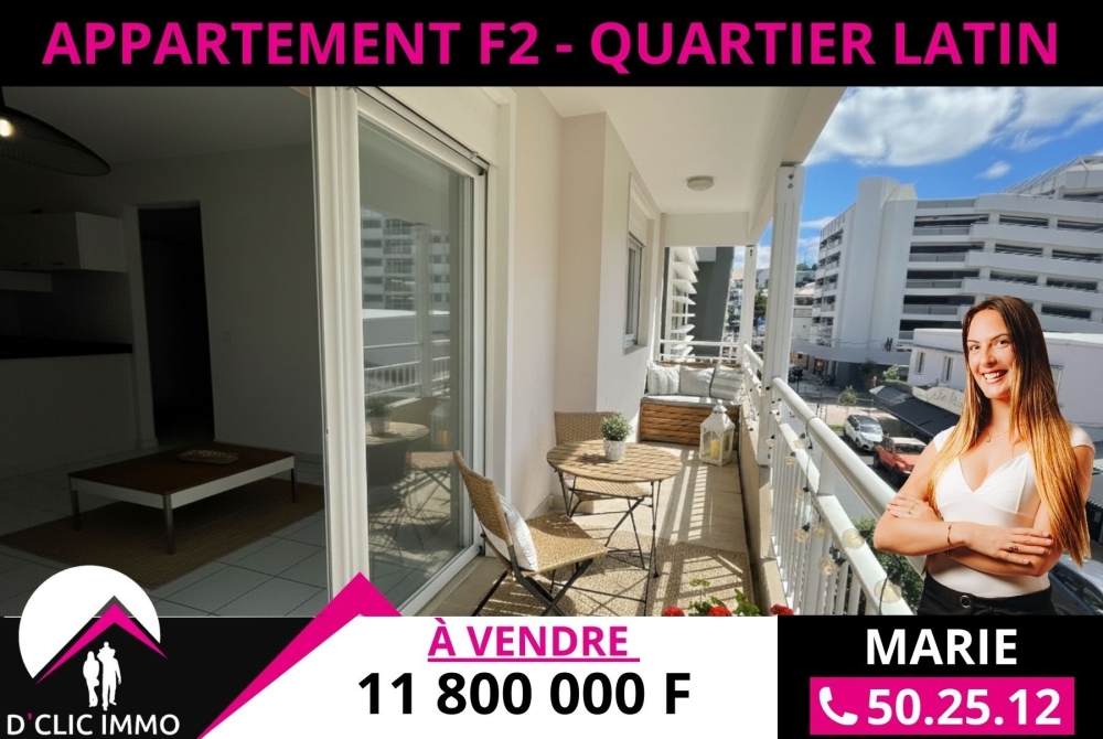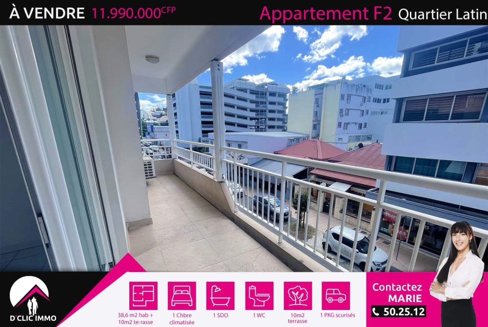 Idéalement situé, proche des commerces, des établissement scolaires et de toutes commodités au Quartier Latin, l'agence D'CLIC IMMO vous propose un spacieux appartement de type F2 de 38.60m² + 10m² de terrasse couverte + cellier + 2 parking sécurisés dont un couvert, situé au R+2 de la Résidence LE FLORE, sécurisée avec ascenseur.
