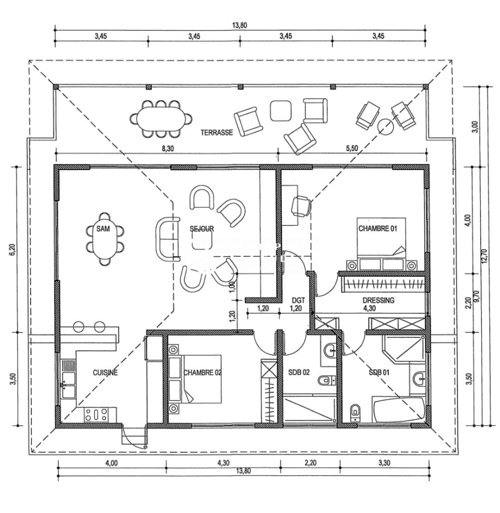Édifiée sur un terrain de 1 800 m², elle se compose : d'un grand salon avec cuisine aménagée, de deux grandes chambres (dont une avec dressing attenant), de deux salles de bains. La grande terrasse couverte de 40 m² offre une vue imprenable sur la végétation et la mer. Enfin, une buanderie attenante et un garage constituent les annexes.