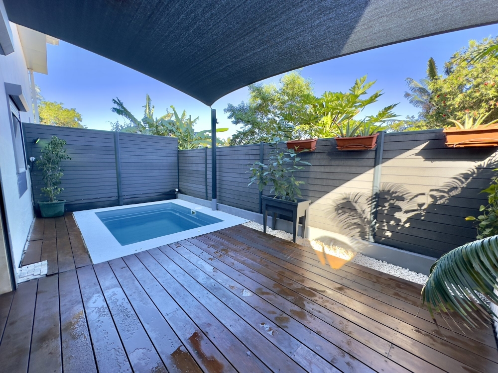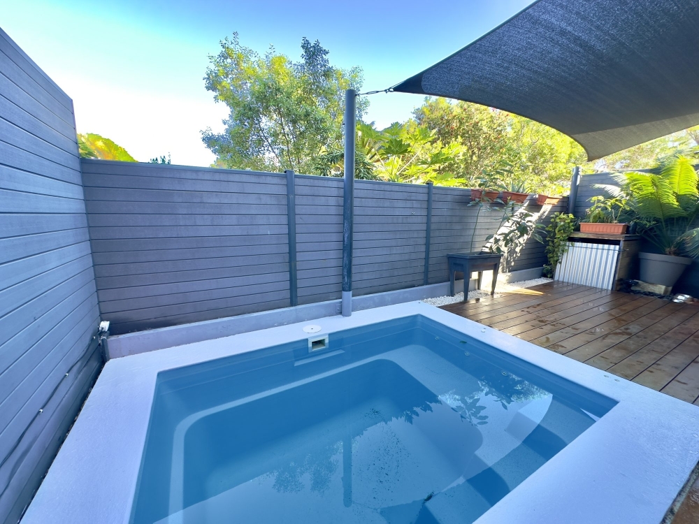 Accès direct à un deck en bois avec petite piscine au sel ?