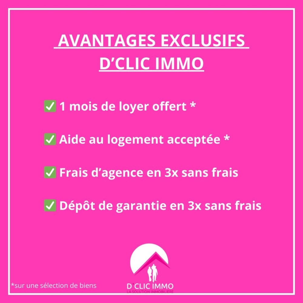 AVANTAGES EXCLUSIFS D'CLIC IMMO :? 1 mois de loyer offert (*sélection de biens)? Frais d'agence réduits en 3x sans frais? Dépôt de garantie en 3x sans frais? Aide au logement acceptée (*sélection de biens)? Visite possible le samedi sur RDV !