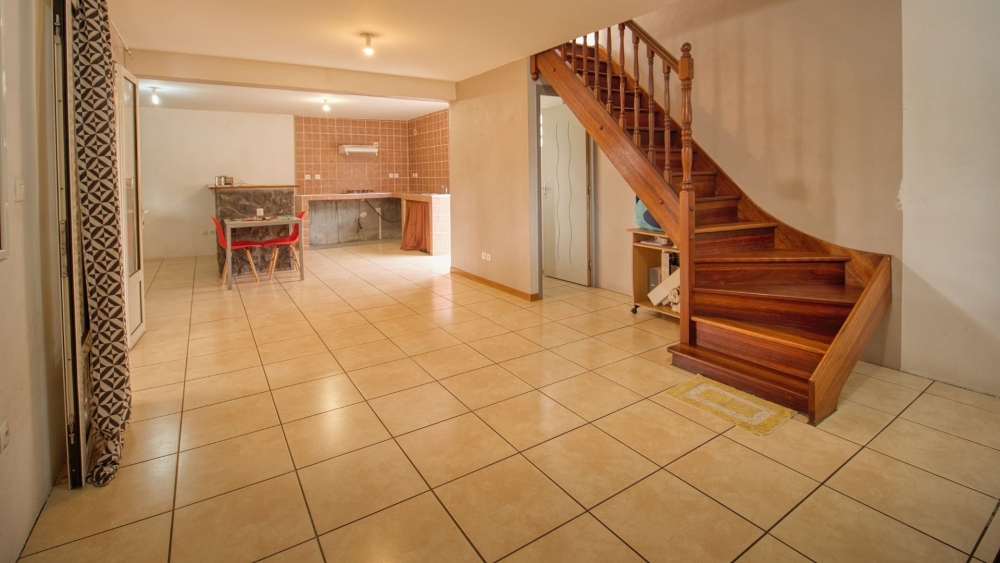 SÉJOUR LUMINEUX DE 25 M² : Ce séjour carrelé s'ouvre sur la varangue fermée et accueille facilement plusieurs zones de vie conviviales.
