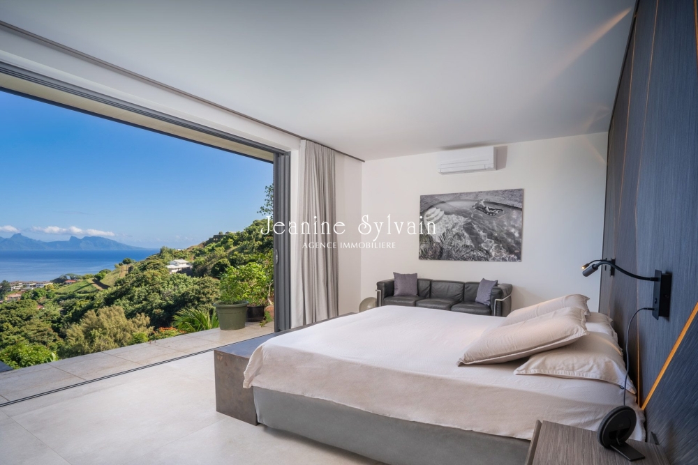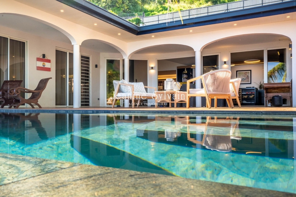 Sur les hauteurs de Punaauia avec vue Moorea plein cadre, villa de prestige entièrement rénovée en 2022, aménagée et décorée par un architecte d'intérieur.