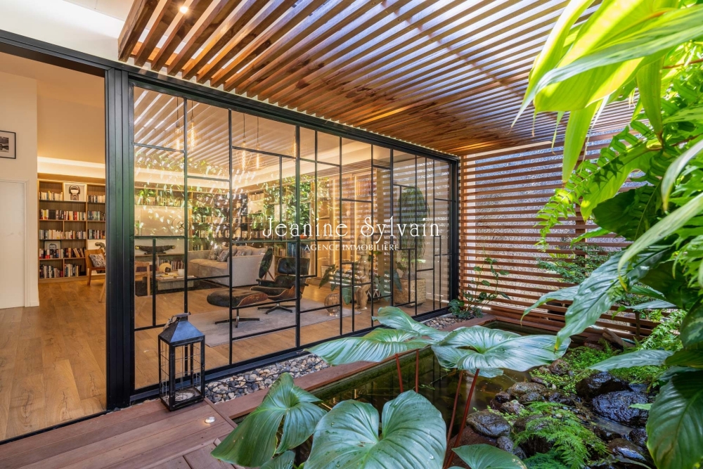 Salle à manger et cuisine, salon bibliothèque vitrée sur un jardin japonais avec bassin à poissons.