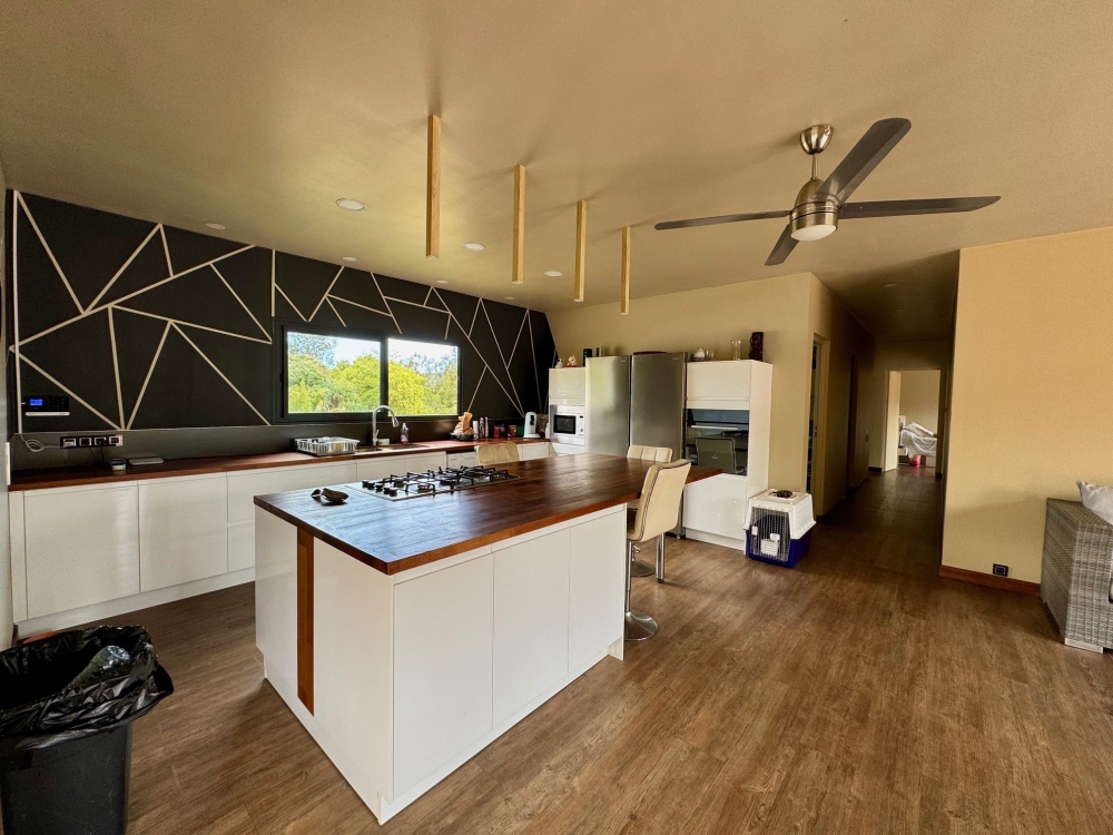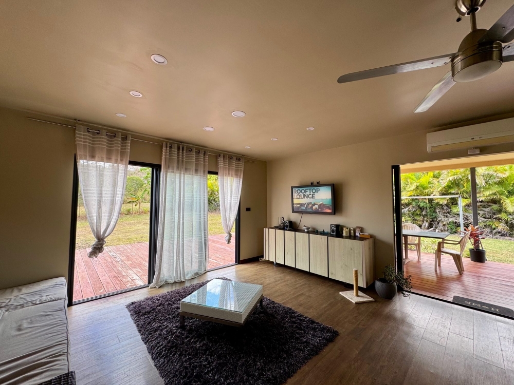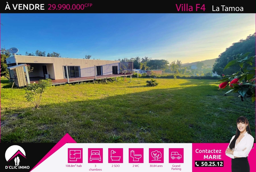 Idéalement située dans un quartier résidentiel de La Tamoa, , l'agence D'CLIC IMMO vous propose une superbe villa individuelle, en construction fibrociment sur pilotis, datant de 2019, de type F4 d'une surface de 108.80m² habitable + 110 m² de terrasses le tout sur un beau terrain plat de 30.84 ares en zone non inondable.